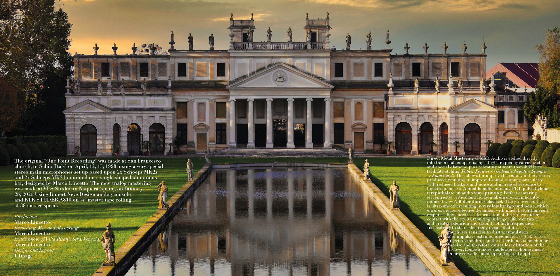 The original “One Point Recording” was made at San Francesco church, in Schio (Italy) on April, 12, 13, 1999, using a very special stereo main microphones set up based upon 2x Schoeps MK2s and 2x Schoeps MK21 mounted on a single shaped aluminous bar, designed by Marco Lincetto. The new analog mastering was made at VLS Studio, in Naquera (Spain), on January, 28, 2026 Using Rupert Neve Design analog console and RTR STUDER A810 on ¼” master tape rolling at 38 cm/sec speed.