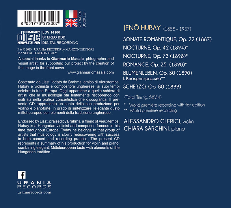 Sostenuto da Liszt, lodato da Brahms, amico di Vieuxtemps, Hubay è violinista e compositore ungherese, ai suoi tempi celebre in tutta Europa. Oggi appartiene a quella schiera di artisti che la musicologia sta lentamente riscoprendo con esiti sia nella pratica concertistica che discografica. Il pre-sente CD rappresenta un sunto della sua produzione per violino e pianoforte, in grado di sintetizzare l’elegante gusto mittel-europeo con elementi della tradizione ungherese.