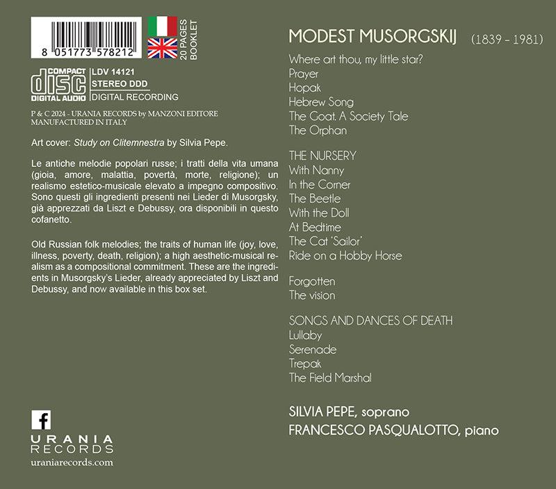 Le antiche melodie popolari russe; i tratti della vita umana (gioia, amore, malattia, povertà, morte, religione); un realismo estetico-musicale elevato a impegno compositivo. Sono questi gli ingredienti presenti nei Lieder di Musorgsky, già apprezzati da Liszt e Debussy, ora disponibili in questo cofanetto.
