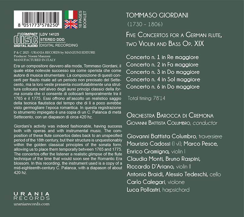ジョルダーニの活動はまさに流行であり、オペラと器楽の両方で成功を収めました。これらのフルート協奏曲の作曲時期は18世紀の特定されていない時期に遡りますが、その構成は紛れもなくソナタ形式の古典派の黄金律の中にあり、1765年から1775年の間に位置づけることができます。これらの協奏曲は、間もなくロマン派の開花期を迎えることになる当時のフルート奏法を、聴き手にリアルに垣間見せてくれます。この録音では、18世紀半ばのC.パランカのコピーが使用されており、音叉は約420Hzです。