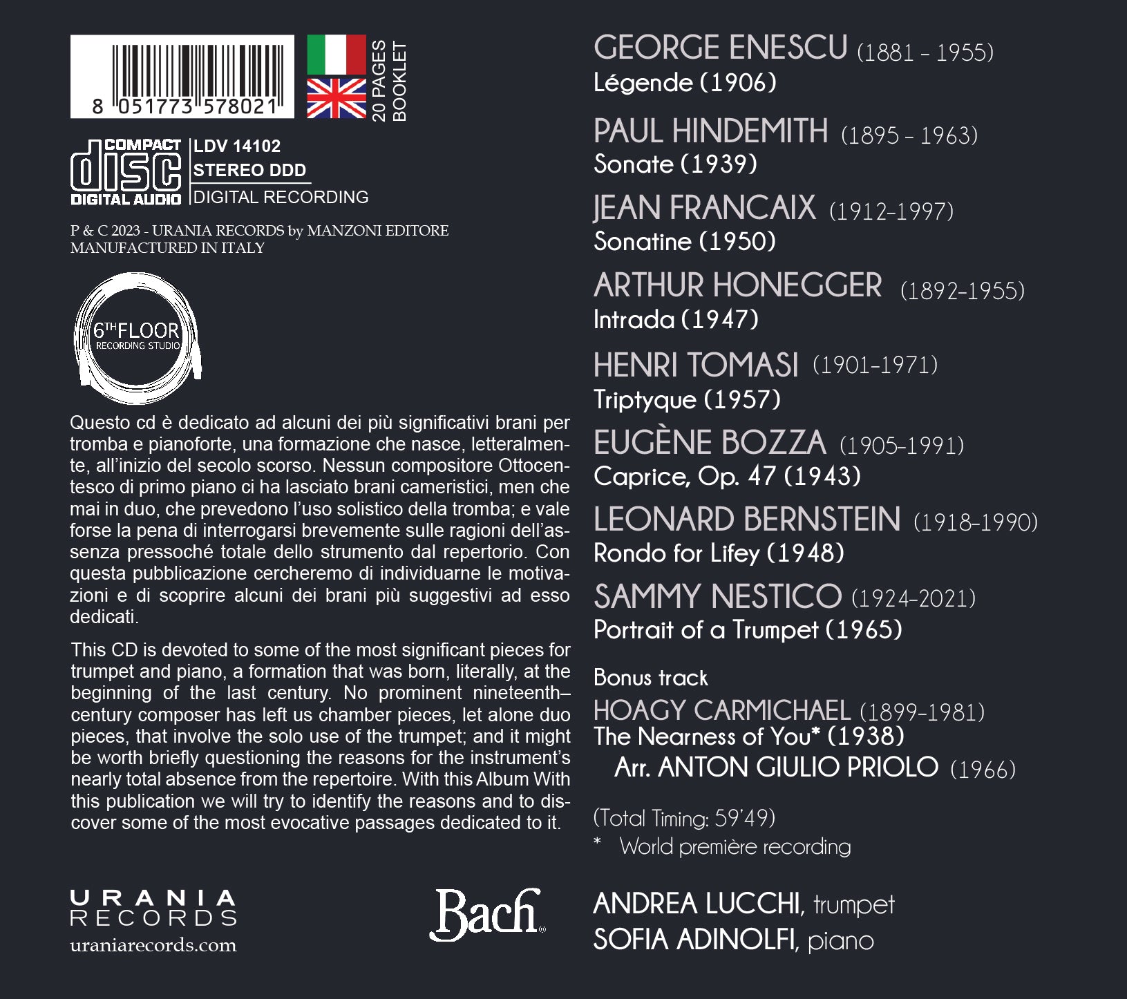 This CD is devoted to some of the most significant pieces for trumpet and piano, a formation that was born, literally, at the beginning of the last century. No prominent nineteenth–century composer has left us chamber pieces, let alone duo pieces, that involve the solo use of the trumpet; and it might be worth briefly questioning the reasons for the instrument’s nearly total absence from the repertoire. With this Album With this publication we will try to identify the reasons and to discover some of the most evocative passages dedicated to it.
